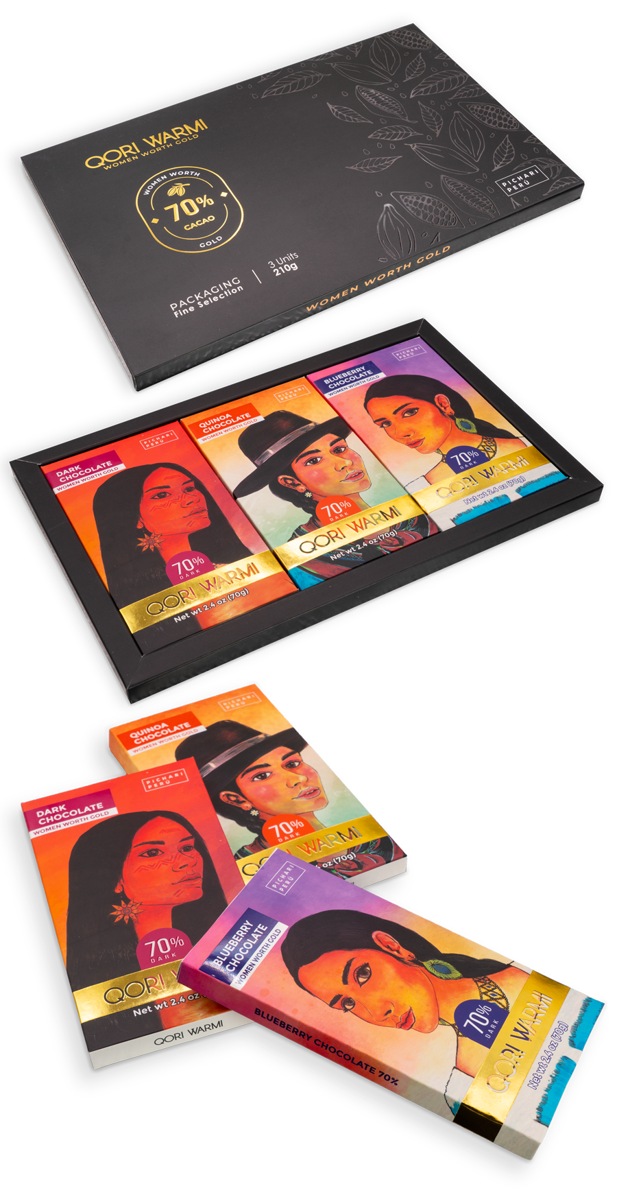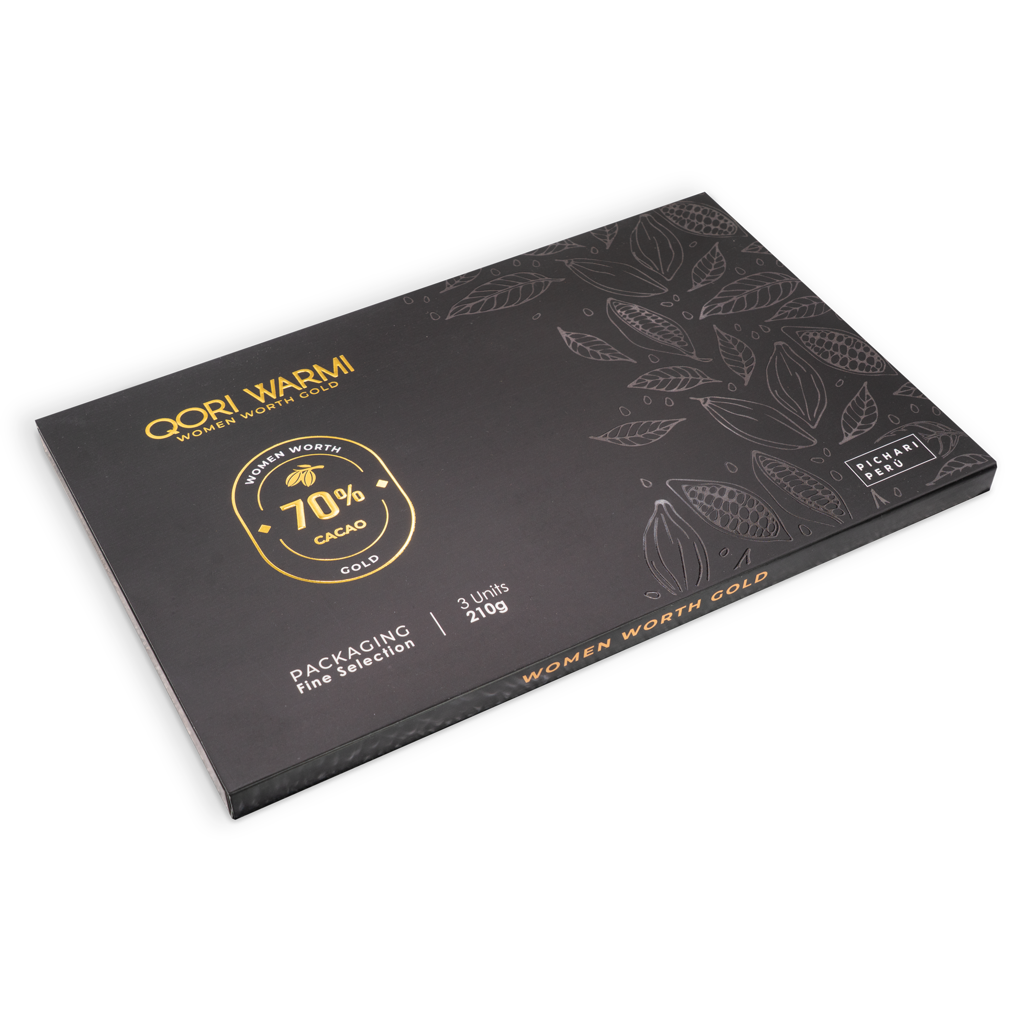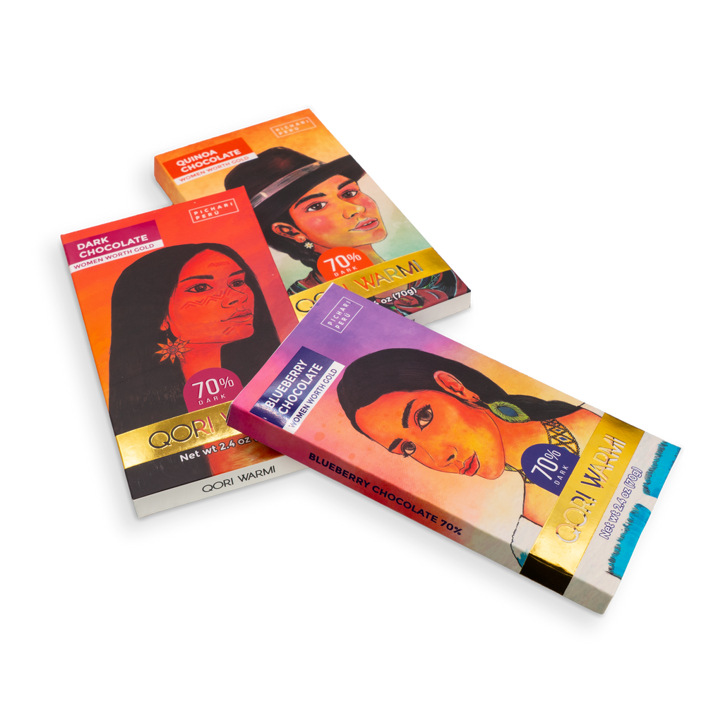 A rich, beautifully packaged trio of 70% dark chocolate bars that makes an easy, meaningful gift - handcrafted by the women of the Qori Warmi cooperative.